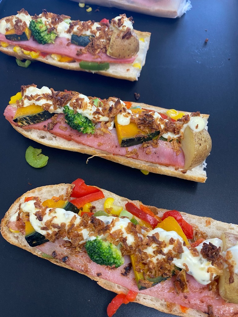 本日のタルティーヌはこんがりベーコンと彩り野菜のタルティーヌです。
