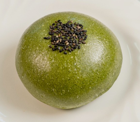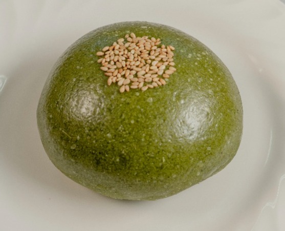 よもぎをたっぷり練りこんだ生地で茜丸の高級つぶあんとお餅を包みました。