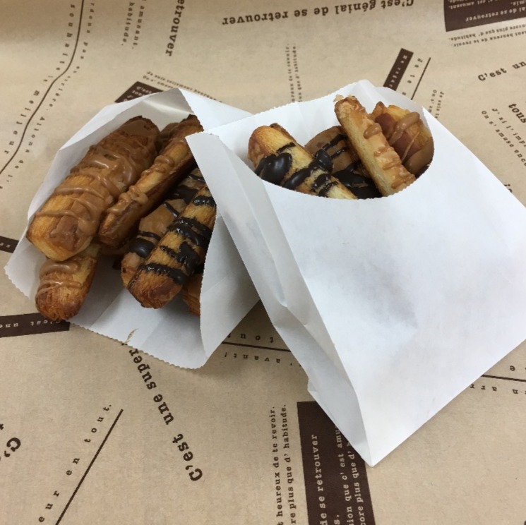 デニッシュ生地の切れ端をサクサクに焼き上げてチョコ、キャラメル等のチョコレートをかけました。
