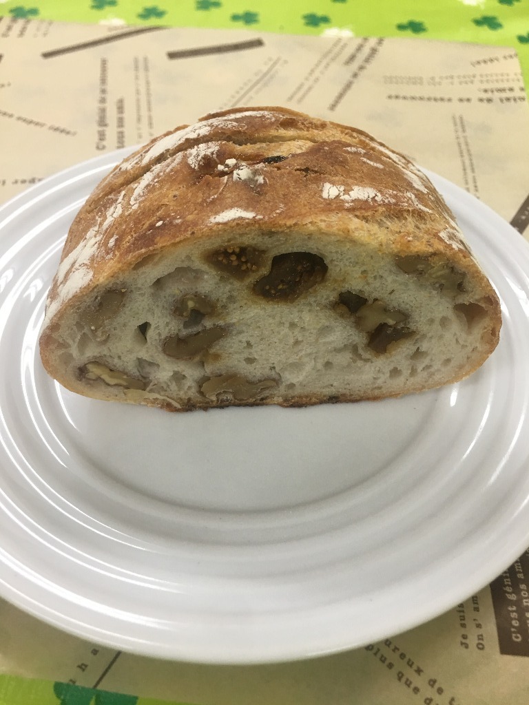 自家培養した酵母種を使い、酵母と小麦粉の風味がとてもいいハード系のライ麦入り生地にクルミとドライイチジクをたっぷり入れました。