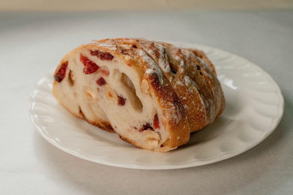 自家培養した酵母種を使い、酵母と小麦粉の風味がとてもいいハード系のライ麦入り生地にヘーゼルナッツとクランベリーをたっぷり入れました。