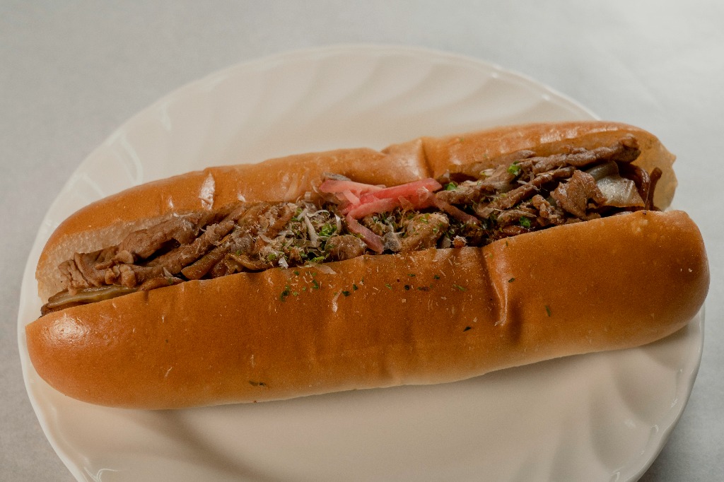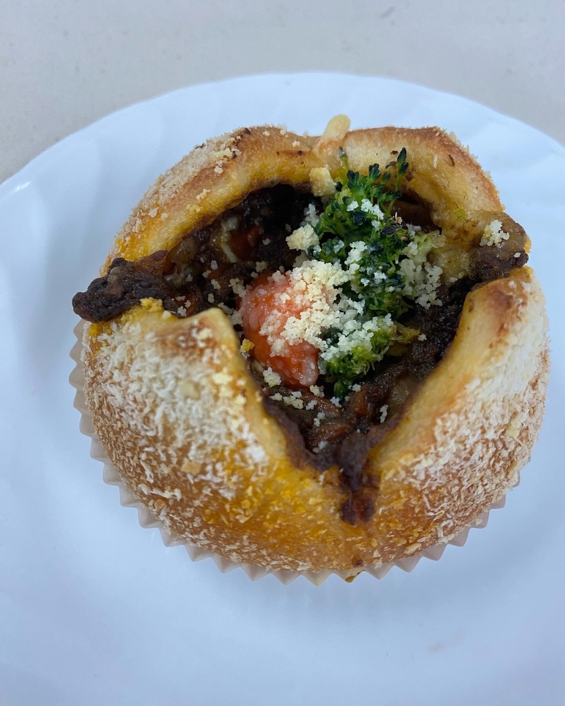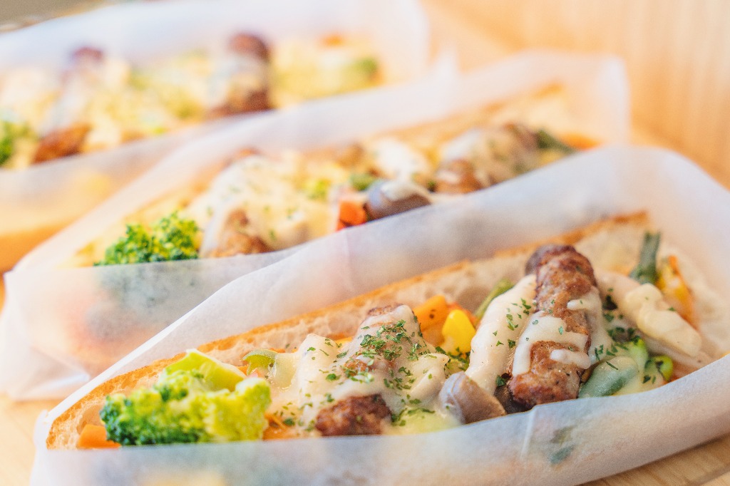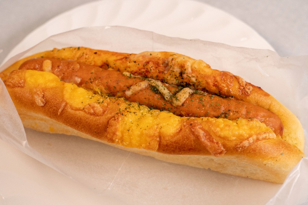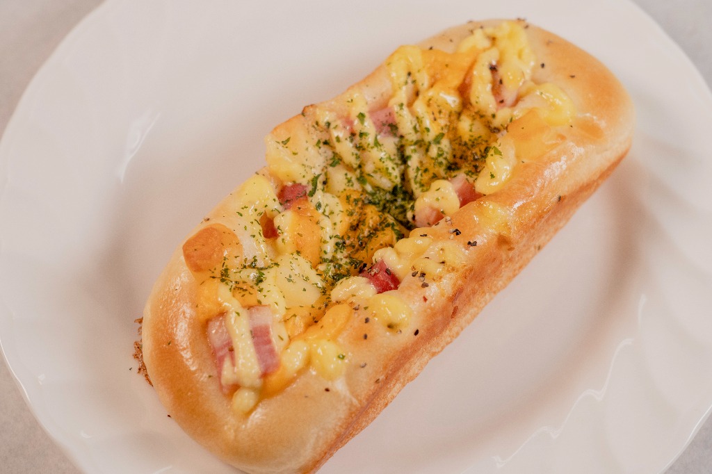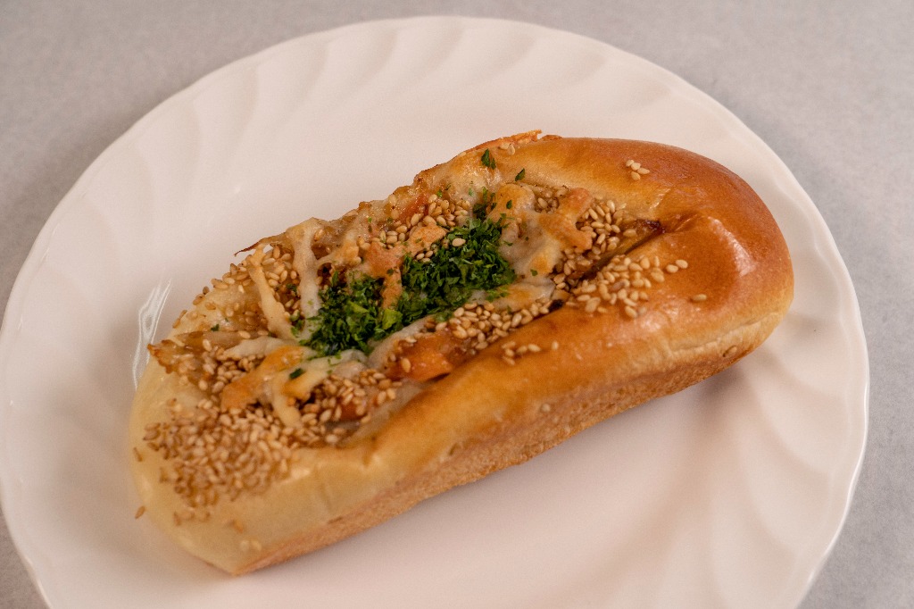 野菜や肉類、チーズなどの具材をたっぷり乗せて焼いたバゲットベースの惣菜パンです。