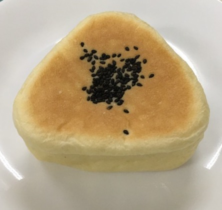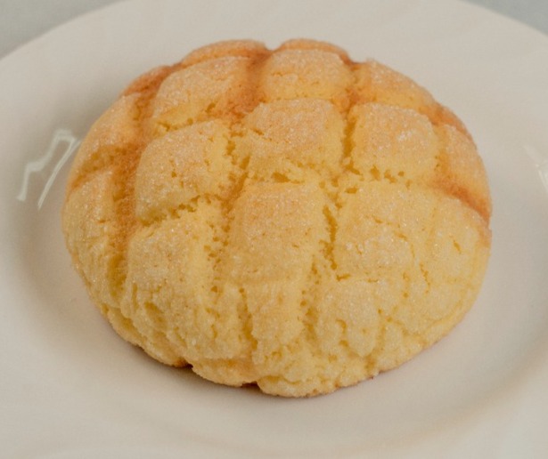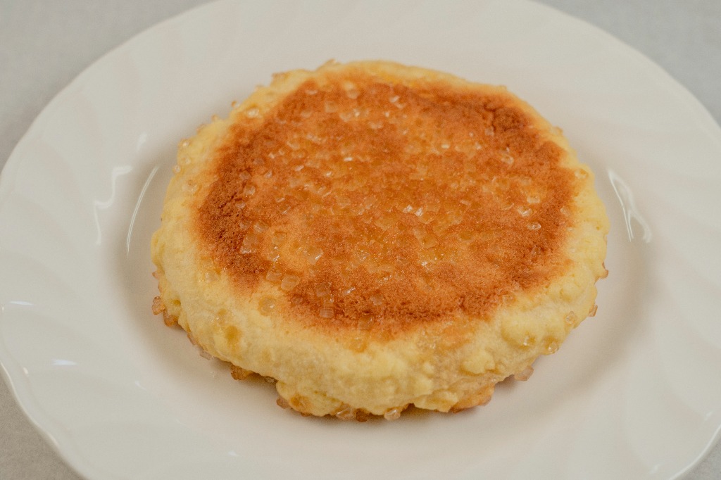 メロンパンの生地にザラメを付け、鉄板で挟んで上下こんがり焼き上げました。