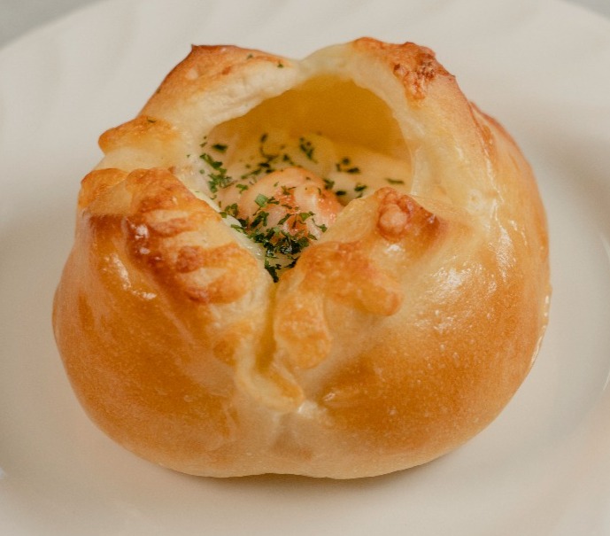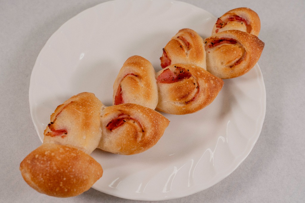 クリームチーズを包んだ生地の切り口から明太子のフィリングをたっぷり注入&トッピングしています。