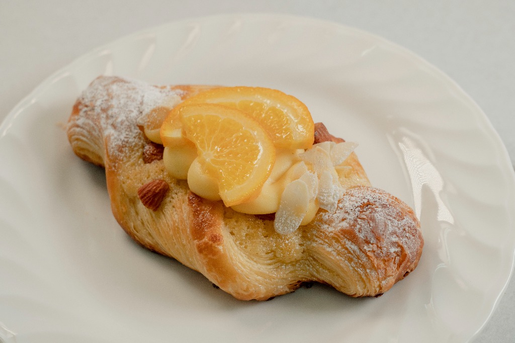 マーマレードを折り込んだデニッシュ生地にアーモンドクリームとクラッシュアーモンドを乗せて焼きあげ、カスタードクリーム、スライスアーモンド、スライスオレンジで仕上げました。