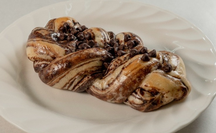 少し甘い生地にチョコシートを三つ編みに折り込みチョコチップを乗せて仕上げました。