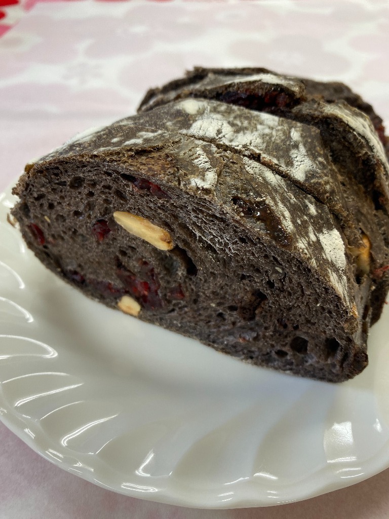 自家培養した酵母種を使い、酵母と小麦粉の風味がとてもいいハード系のライ麦入り生地にココアとチョコを練りこんでカシューナッツとクランベリーをたっぷり入れました。