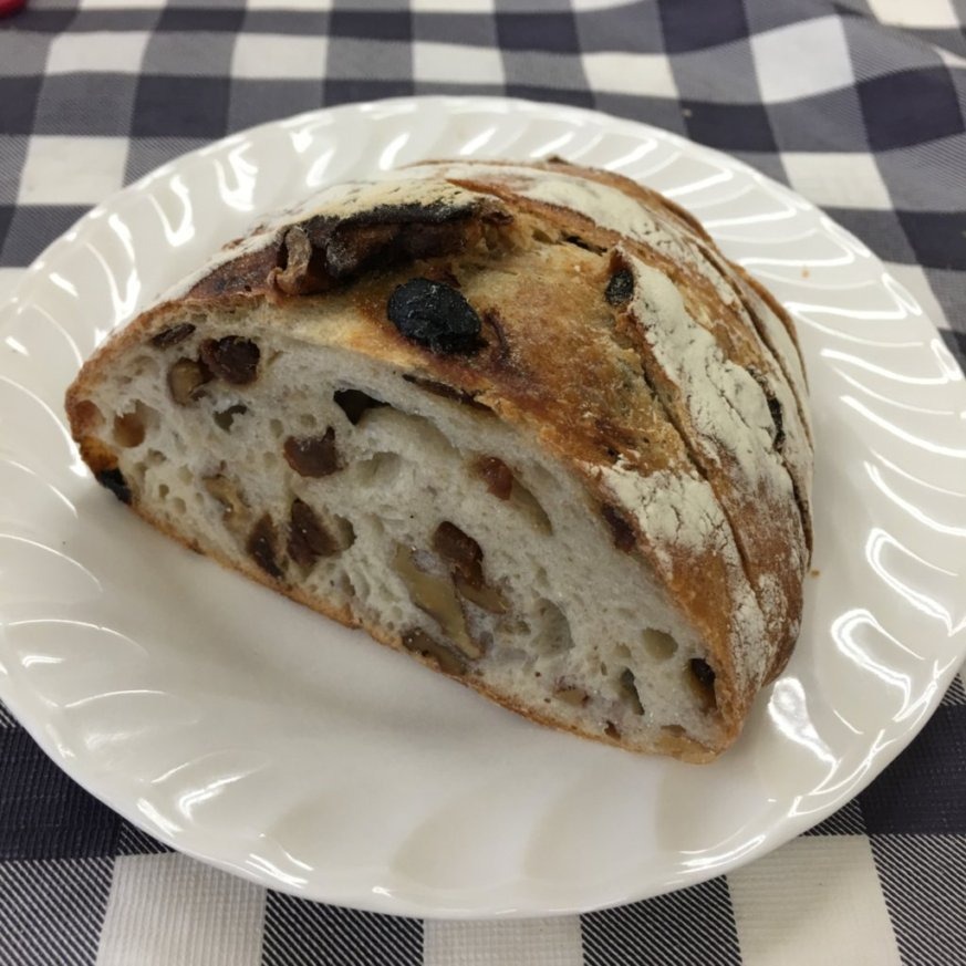 自家培養した酵母種を使い、酵母と小麦粉の風味がとてもいいハード系のライ麦入り生地にクルミとレーズンをたっぷり入れました。