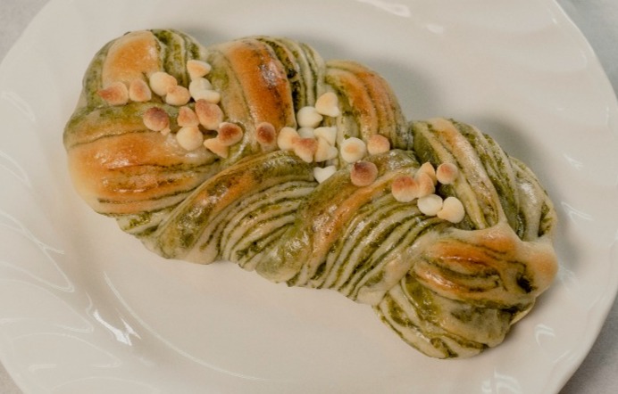 少し甘い生地に抹茶シートを折り込み三つ編みに仕上げ、ホワイトチョコチップを乗せました。